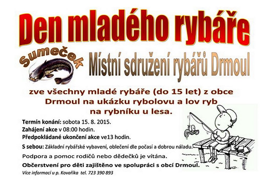 Na sobotu 15. srpna 2015 byla spolkem rybářů Sumeček ve spolupráci s obcí Drmoul připravena akce pro děti na rybníku u lesa. I přes prezentaci této akce na vývěskách i webu obce byla účast dětí velmi malá. Přiznejme, že se sešlo více organizátorů než dětí. Co k tomu dodat?!